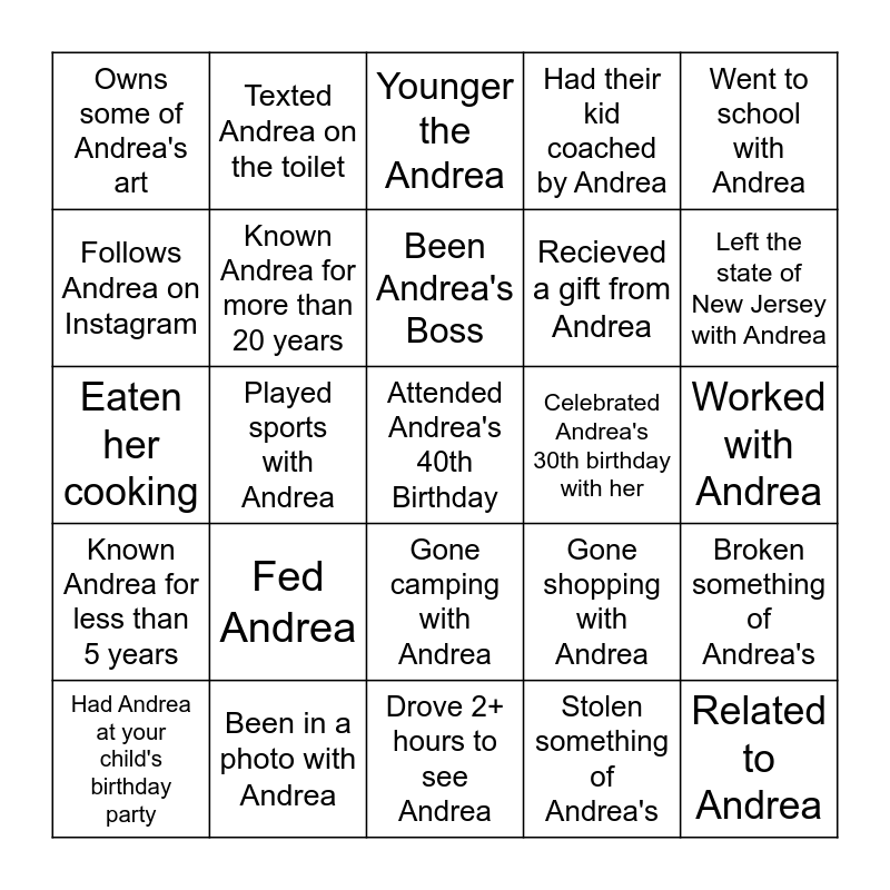 This bingo card has a free space and 40 words: Travelled with Andrea, Eaten her cooking, Worked on an art project with her, Known Andrea for more than 20 years, Been in a photo with Andrea, Gone camping with Andrea, Been Andrea's Boss, Andrea's Child, Went to school with Andrea, Known Andrea for less than 5 years, Played sports with Andrea, Had their kid coached by Andrea, Related to Andrea, Worked with Andrea, Celebrated Andrea's 30th birthday with her, Fed Andrea, Has Andrea's phone number in their phone contact favorites, Owns some of Andrea's art, Older than Andrea, Younger the Andrea, Broken something of Andrea's, Stolen something of Andrea's, Recieved a gift from Andrea, Follows Andrea on Instagram, Been scolded by Andrea IRL or Online, Played games with Andrea, Been to Andrea's house, Talked to Andrea for more than 3 hours, Cried with Andrea, Had face painted by Andrea, Had Andrea at your birthday party, Had Andrea at your child's birthday party, Taken a long walk with Andrea, Gone shopping with Andrea, Left the state of New Jersey with Andrea, Drove 2+ hours to see Andrea, Cut Andrea's hair, Called her Andreuuuh, Texted Andrea on the toilet and Gave birth to Andrea.