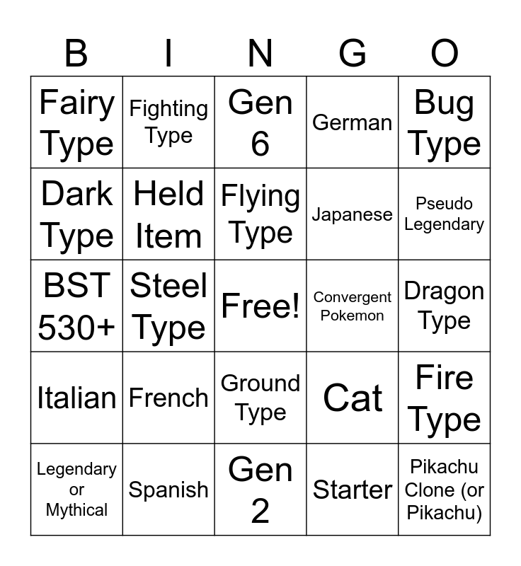 This bingo card has a free space and 64 words: Normal Type, Grass Type, Water Type, Fire Type, Electric Type, Ice Type, Fighting Type, Ghost Type, Flying Type, Rock Type, Ground Type, Psychic Type, Dragon Type, Bug Type, Poison Type, Dark Type, Steel Type, Fairy Type, Chinese, Japanese, French, Italian, German, Gen 1, Under 1', Scarlet Exclusive, Violet Exclusive, Kitakami Only, Blueberry Only, Shiny, Website Name, Nicknamed (Not a Website), Different Tera Type, Hidden Ability, Pseudo Legendary, Legendary or Mythical, Fish, Starter, No Evos, Held Item, BST 530+, Convergent Pokemon, Regional Form, Third-Stage Evolution, Paradox, Pikachu Clone (or Pikachu), Spanish, Dog, Cat, Bird, Reptile, Over 300lb, Gen 2, Gen 3, Gen 4, Gen 5, Gen 6, Gen 7, Gen 8, Level 1, Always Male/Always Female, Name that Starts with Vowel, Over 7ft and Over 140lbs.