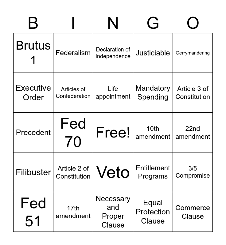 This bingo card has a free space and 29 words: Fed 51, Fed 78, Fed 70, Fed 10, Brutus 1, Declaration of Independence, Articles of Confederation, Article 2 of Constitution, 10th amendment, 17th amendment, 22nd amendment, Commerce Clause, Necessary and Proper Clause, Equal Protection Clause, Article 3 of Constitution, Bill of Rights, Veto, Filibuster, Gerrymandering, Precedent, Entitlement Programs, Discretionary Spending, Mandatory Spending, Executive Order, Justiciable, Federalism, 3/5 Compromise, Life appointment and 6 year term.