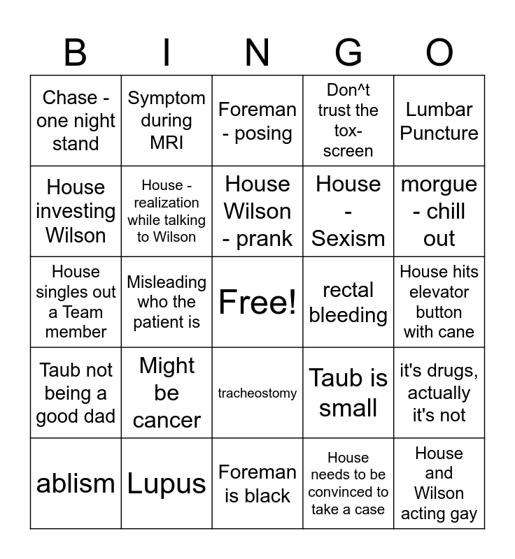 This bingo card has a free space and 30 words: Lupus, Monstertrucks, Misleading who the patient is, Breaking and entering, Chase - one night stand, Foreman - posing, House - realization while talking to Wilson, tracheostomy, rectal bleeding, Foreman is black, House hits elevator button with cane, House and Wilson acting gay, House needs to be convinced to take a case, clinic hours, morgue - chill out, Park and Adams fight, Taub is small, Taub not being a good dad, Might be cancer, Lumbar Puncture, House singles out a Team member, Patient is lying, Symptom during MRI, House - Sexism, House investing Wilson, Don^t trust the tox-screen, it's drugs, actually it's not, ablism, House Wilson - prank and Let's make the patient worse on purpose.
