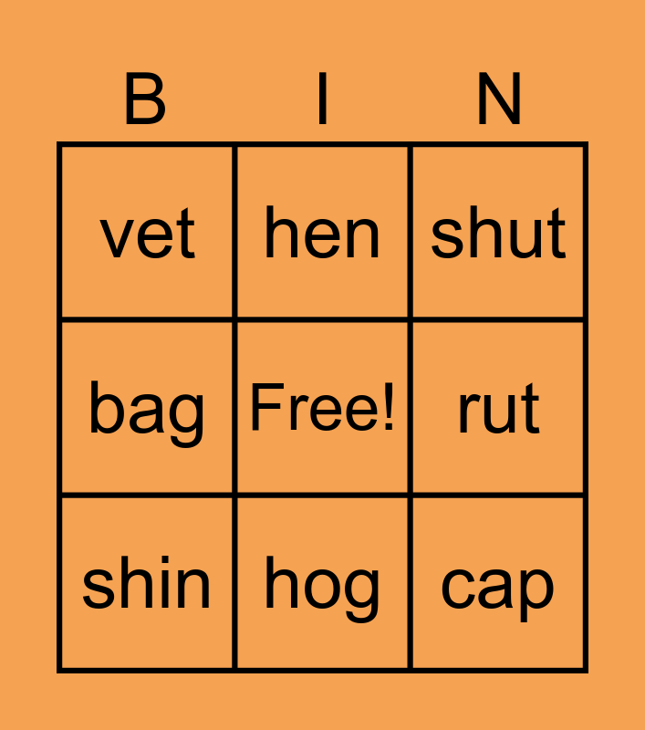 This bingo card has a free space and 8 words: rut, shut, hen, shin, vet, cap, bag and hog.