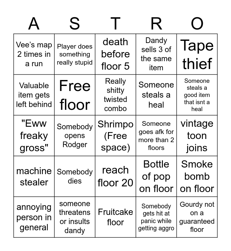This bingo card has a free space and 50 words: Twisted Pebble, Gourdy not on a guaranteed floor, Multiple mains, Fruitcake floor, Somebody dies, Somebody gets hit, Player does something really stupid, Gigi steals a valuable item, Valuable item gets left behind, Box of chocolates on floor, Free floor, Dandy sells 3 of the same item, Smoke bomb on floor, Bottle of pop on floor, Medkit on floor, Both craft siblings on a floor, Really shitty twisted combo, Someone goes afk for more than 2 floors, Multiple good items on floor at once, Tape thief, Somebody opens Rodger, Somebody gets hit at panic while getting aggro, Vee’s map 2 times in a run, Someone steals a heal, Somebody says something weird/crazy in chat, Somebody gets hit by a passive twisted, Someone steals a good item that isnt a heal, Terrible trinkets, death before floor 5, reach floor 20, reach floor 10, ichor spill, blackout, distractor gets hit before floor 5, someone threatens or insults dandy, forsaken fan in lobby, someone leaves before dying or dies on purpose, someone buys an item for a crappy run, someone fiending over gourdy research, vintage toon joins, beginner in lineup, unfunny joke is told, ... or ., Anyone gets humped, annoying person in general, "Eww freaky gross", reached floor 5 without death, Someone reaches machine before you, machine stealer and dont get to veemote.