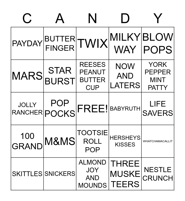 This bingo card has a free space and 24 words: M&MS, SNICKERS, REESES PEANUT BUTTER CUP, SKITTLES, BLOW POPS, PAYDAY, MARS, BUTTER FINGER, BABYRUTH, TOOTSIE ROLL POP, NOW AND LATERS, JOLLY RANCHER, HERSHEYS KISSES, WHATCHAMACALLIT, STAR BURST, THREE MUSKE TEERS, LIFE SAVERS, TWIX, YORK PEPPER MINT PATTY, POP POCKS, NESTLE CRUNCH, 100 GRAND, MILKY WAY and ALMOND JOY AND MOUNDS.