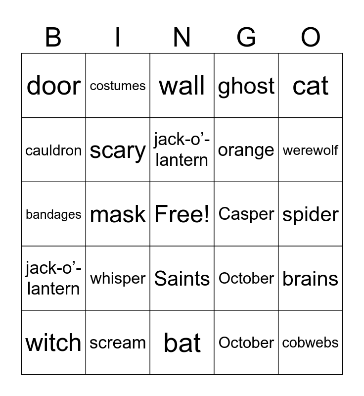 This bingo card has a free space and 71 words: cat, costumes, pumpkins, treat, bat, broom, ghost, Frankenstein, orange, vampire, witch, bones, werewolf, door, house, bandages, October, cat, bucket, spider, whisper, cobwebs, brains, jack-o’-lantern, moon, coffin, hoot, Mischief, scarecrow, pumpkin, scream, medium, black, marshmallows, October, curse, potion, boo, cauldron, Frankenstein, Saints, treats, jack-o’-lantern, zombie, black, skeleton, treat, scary, cackle, bats, fake, spoon, Casper, ghost, black, goose, jack-o’-lantern, fog, house, sky, vampire, door, mask, glow, corn, spooky, wall, caramel, ghost, full and cavities.