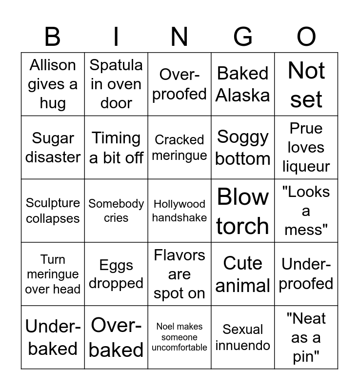 This bingo card has a free space and 24 words: Eggs dropped, Over-baked, Cracked meringue, Under-baked, Not set, Allison gives a hug, Sugar disaster, Spatula in oven door, Blow torch, Flavors are spot on, Soggy bottom, Sculpture collapses, Cute animal, Under-proofed, Timing a bit off, Sexual innuendo, "Looks a mess", Over-proofed, Prue loves liqueur, Somebody cries, "Neat as a pin", Turn meringue over head, Baked Alaska and Noel makes someone uncomfortable.