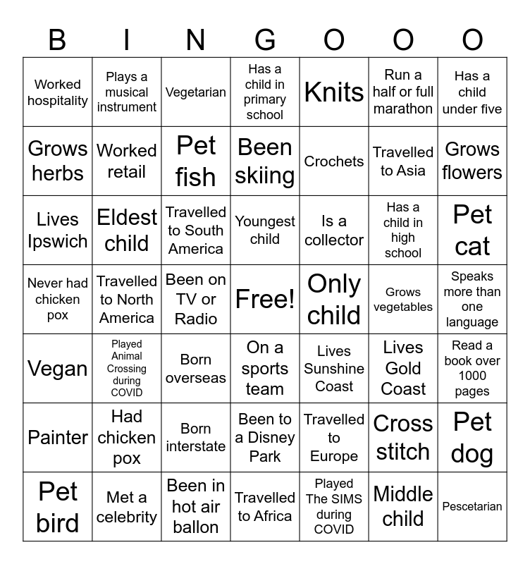 This bingo card has a free space and 48 words: Travelled to Europe, Travelled to Asia, Travelled to Africa, Travelled to North America, Travelled to South America, Speaks more than one language, Plays a musical instrument, Met a celebrity, Run a half or full marathon, On a sports team, Has a child under five, Has a child in primary school, Has a child in high school, Is a collector, Painter, Grows vegetables, Grows herbs, Grows flowers, Cross stitch, Knits, Crochets, Been on TV or Radio, Worked hospitality, Worked retail, Pet dog, Pet fish, Pet cat, Pet bird, Youngest child, Eldest child, Middle child, Only child, Read a book over 1000 pages, Had chicken pox, Never had chicken pox, Lives Sunshine Coast, Lives Gold Coast, Lives Ipswich, Born overseas, Born interstate, Vegan, Pescetarian, Vegetarian, Been in hot air ballon, Been skiing, Been to a Disney Park, Played Animal Crossing during COVID and Played The SIMS during COVID.
