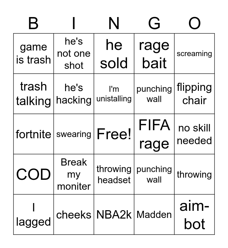 This bingo card has a free space and 24 words: Break my moniter, cheeks, I'm unistalling, I lagged, screaming, game is trash, trash talking, he's not one shot, FIFA rage, throwing headset, punching wall, fortnite, punching wall, throwing, he's hacking, Madden, no skill needed, he sold, flipping chair, swearing, aim-bot, COD, rage bait and NBA2k.
