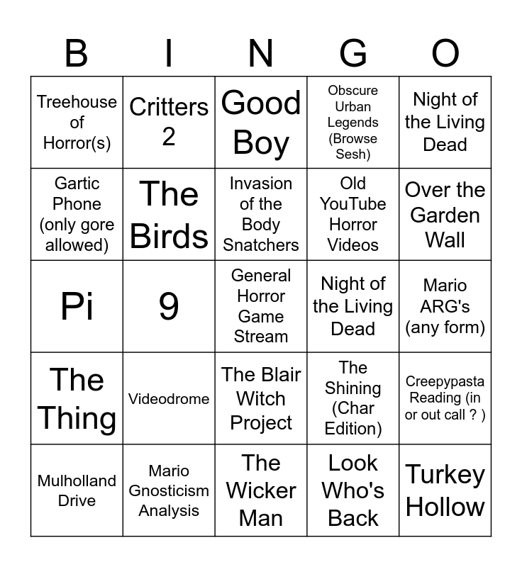 This bingo card has a free space and 24 words: Videodrome, Mario Gnosticism Analysis, Invasion of the Body Snatchers, Mulholland Drive, Night of the Living Dead, Treehouse of Horror(s), Gartic Phone (only gore allowed), Critters 2, Night of the Living Dead, The Blair Witch Project, Old YouTube Horror Videos, Pi, The Shining (Char Edition), Creepypasta Reading (in or out call ? ), The Birds, Look Who's Back, Mario ARG's (any form), Good Boy, Over the Garden Wall, 9, Turkey Hollow, The Thing, Obscure Urban Legends (Browse Sesh) and The Wicker Man.