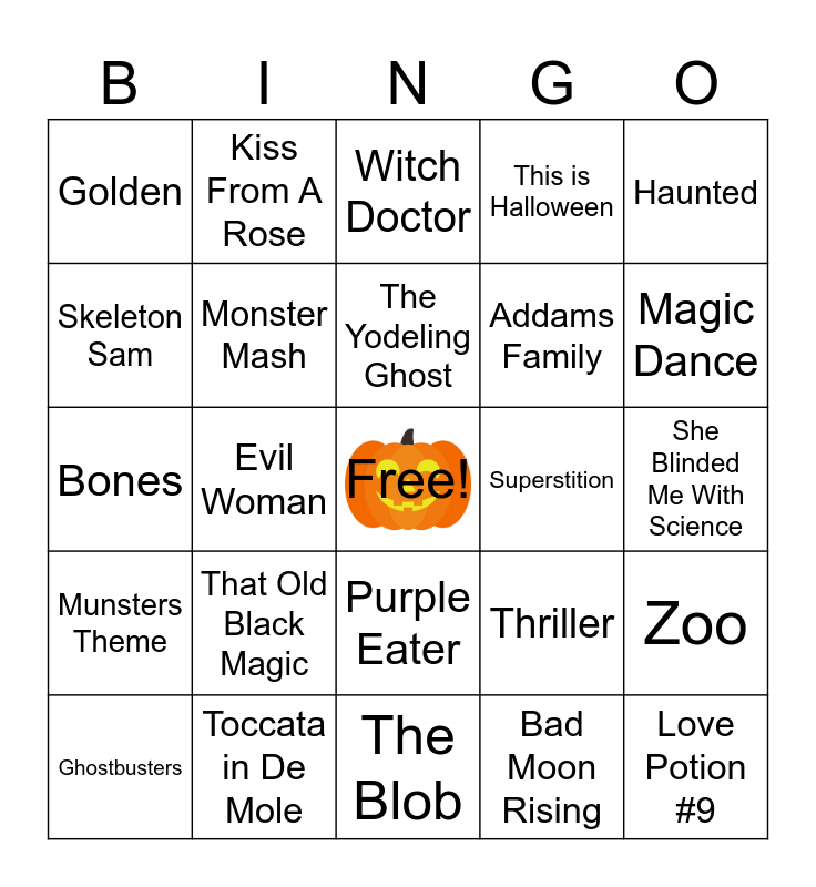 This bingo card has a free space and 29 words: Ghostbusters, The Martian Hop, Evil Woman, The Great Pumpkin Waltz, Golden, Witch Doctor, Monster Mash, That Old Black Magic, Superstition, Toccata in De Mole, She Blinded Me With Science, Love Potion #9, The Blob, Bad Moon Rising, Magic Dance, Twilight Zone Theme, Purple Eater, Munsters Theme, Haunted, Bones, Thriller, Spooky, Addams Family, Skeleton Sam, This is Halloween, Kiss From A Rose, Zoo, The Yodeling Ghost and Jeepers Creepers.