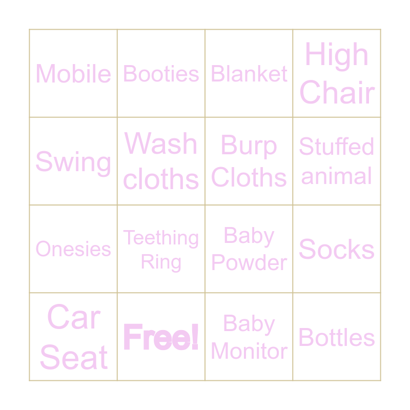 This bingo card has 24 words: Pacifier, Clothes, Stuffed animal, Sound machine, Swing, Mobile, Wash cloths, Booties, Free!, Diaper cream, Onesies, Baby Powder, Bibs, Crib Sheets, Burp Cloths, Stroller, Baby Monitor, Blanket, Teething Ring, Socks, Car Seat, Bottles, High Chair and Diapers.