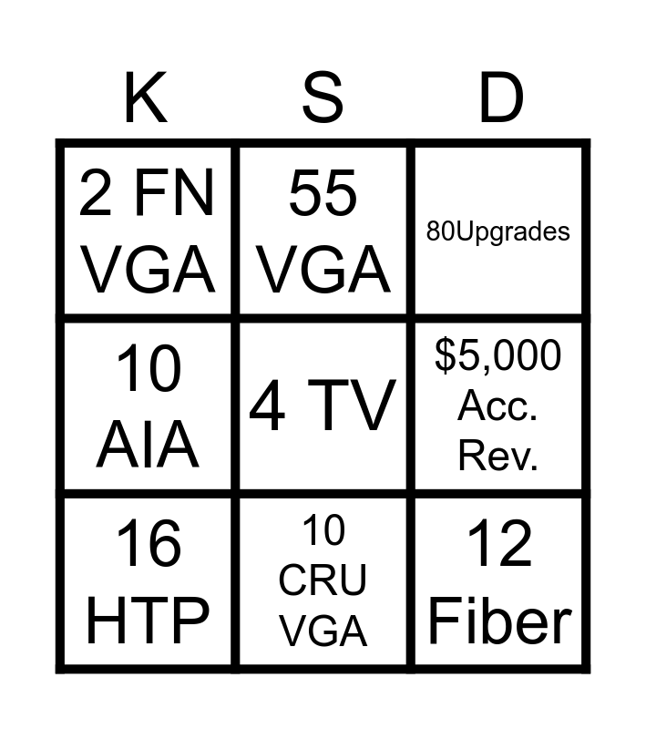 This bingo card has a free space and 8 words: 10 AIA, 55 VGA, $5,000 Acc. Rev., 16 HTP, 80Upgrades, 2 FN VGA, 10 CRU VGA and 12 Fiber.