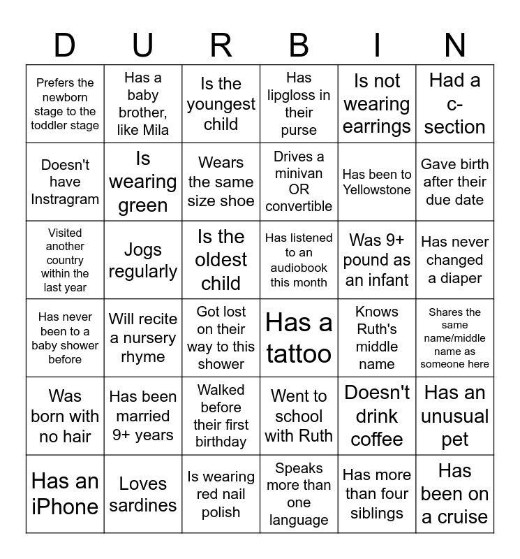 This bingo card has 42 words: Has more than four siblings, Is wearing green, Has never left their birth country, Was 9+ pound as an infant, Shares the same name/middle name as someone here, Will recite a nursery rhyme, Visited another country within the last year, Has a November birthday, Is the youngest child, Has never changed a diaper, Is the oldest child, Drives a minivan OR convertible, Gave birth after their due date, Is not wearing earrings, Loves sardines, Has never been to a baby shower before, Has an unusual pet, Has been to Yellowstone, Has been on a cruise, Has a baby brother, like Mila, Had a c-section, Walked before their first birthday, Was born with no hair, Prefers the newborn stage to the toddler stage, Went camping this summer, Has an iPhone, Wears the same size shoe, Is left handed, Has been married 9+ years, Doesn't drink coffee, Knows Mila's middle name, Has listened to an audiobook this month, Doesn't have Instragram, Knows Ruth's middle name, Is wearing red nail polish, Got lost on their way to this shower, Has a tattoo, Jogs regularly, Went to school with Ruth, Speaks more than one language, Has lipgloss in their purse and Is a vegetarian.