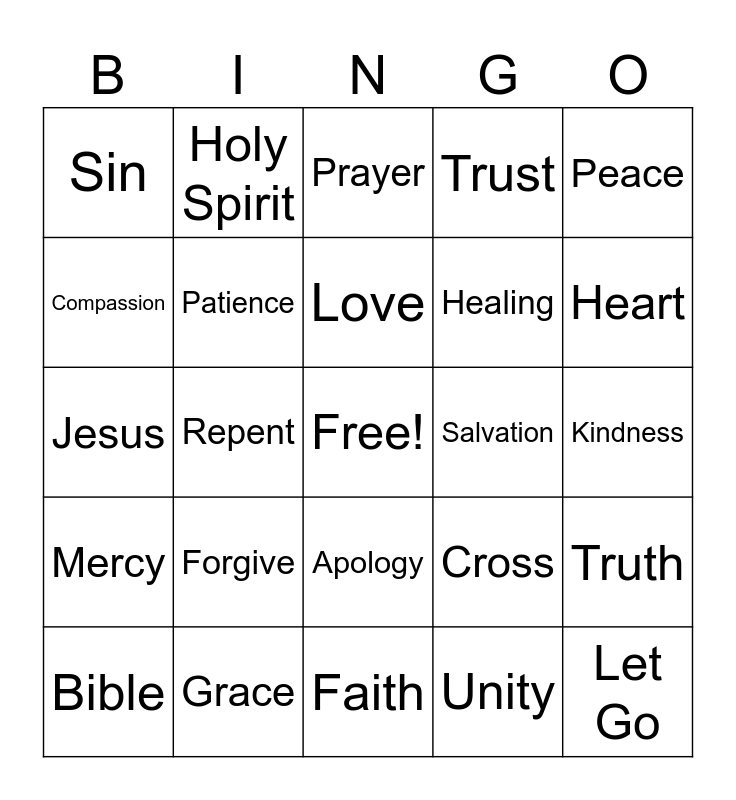This bingo card has a free space and 24 words: Forgive, Grace, Love, Bible, Peace, Sin, Compassion, Holy Spirit, Salvation, Apology, Healing, Jesus, Cross, Truth, Patience, Unity, Kindness, Prayer, Heart, Repent, Let Go, Mercy, Trust and Faith.