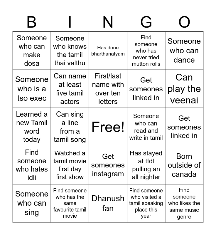 This bingo card has a free space and 25 words: Watched a tamil movie first day first show, Dhanush fan, First/last name with over ten letters, Someone who can sing, Someone who can dance, Someone who can make dosa, Someone who is a tso exec, Someone who knows the tamil thai valthu, Someone who can read and write in tamil, Get someones instagram, Get someones linked in, Learned a new Tamil word today, Has stayed at tfdl pulling an all nighter, Born outside of canada, Can name at least five tamil actors, Can name at least five tamils actresses, Get someones linked in, Has done bharthanatyam, Can play the veenai, Can sing a line from a tamil song, Find someone who likes the same music genre, Find someone who has the same favourite tamil movie, Find someone who hates idli, Find someone who has never tried mutton rolls and Find someone who visited a tamil speaking place this year.