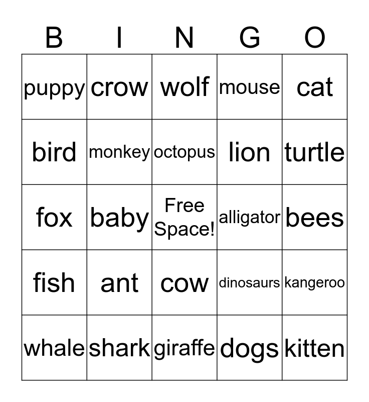 This bingo card has a free space and 24 words: ant, shark, octopus, whale, cat, puppy, bird, crow, alligator, cow, lion, fox, dinosaurs, kangeroo, monkey, dogs, bees, wolf, turtle, baby, kitten, fish, mouse and giraffe.