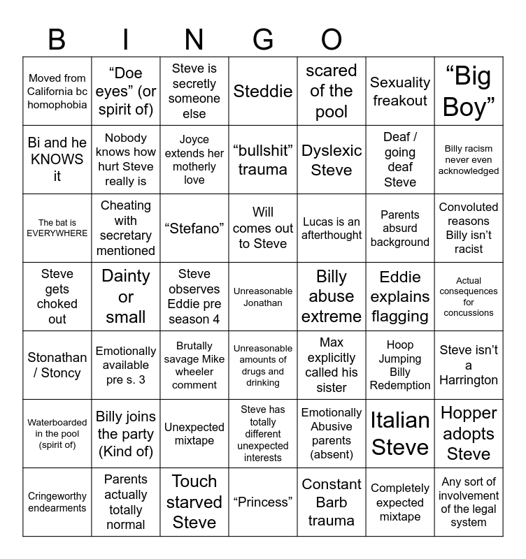 This bingo card has 77 words: Steve is 7 / has powers, Waterboarded in the pool (spirit of), Steve is secretly someone else, Emotionally Abusive parents (absent), Steve gets kicked out, Still King Steve, Hoop Jumping Billy Redemption, Extremely unhealthy and unrealistic Harringrove, Max explicitly called his sister, Unreasonable Nancy, Unreasonable Jonathan, “Little Byers”, Bi and he KNOWS it, Sexuality freakout, 4 season LONG sexuality freakout, Dyslexic Steve, Actual consequences for concussions, Deaf / going deaf Steve, Absurd whump, scared of the pool, Unreasonable amounts of drugs and drinking, “bullshit” trauma, “Big Boy”, “Doe eyes” (or spirit of), Steddie, “Princess”, Cringeworthy endearments, Touch starved Steve, Steve Robin mind meld level friendship, “Fruity four”, Brutally savage Mike wheeler comment, Hopper triggers fight or flight mode, Steve considers Eleven a sister, Lucas is an afterthought, Joyce extends her motherly love, Nobody knows how hurt Steve really is, Tommy and Carol neutral / redemption, Parental Investment, The bat is EVERYWHERE, Steve observes Eddie pre season 4, Steve has totally different unexpected interests, Unexpected mixtape, Completely expected mixtape, Steve gets Vecna’d, Stalking the mall to see the sailor outfit, Billy abuse extreme, Convoluted reasons Billy isn’t racist, Moved from California bc homophobia, Knowingly closeted Billy Hargrove, Eddie frequents Naptown gay bars, Eddie explains flagging, Will comes out to Steve, Steve is Joyce byer’s son, Steve isn’t a Harrington, Constant Barb trauma, It’s like bob never existed, Stonathan / Stoncy, Italian Steve, trapped in the upside down, Hopper adopts Steve, “Stefano”, Steve actually great at fighting, Steve is hatecrimed, Any sort of involvement of the legal system, Wild background for Billy, Billy joins the party (Kind of), Different plate scene, Billy racism never even acknowledged, Emotionally available pre s. 3, Someone calls Steve dumb, Parents actually totally normal, Parents absurd background, Cheating with secretary mentioned, Steve gets choked out, Absurdly beautiful, Dainty or small and Nighttime quarry.