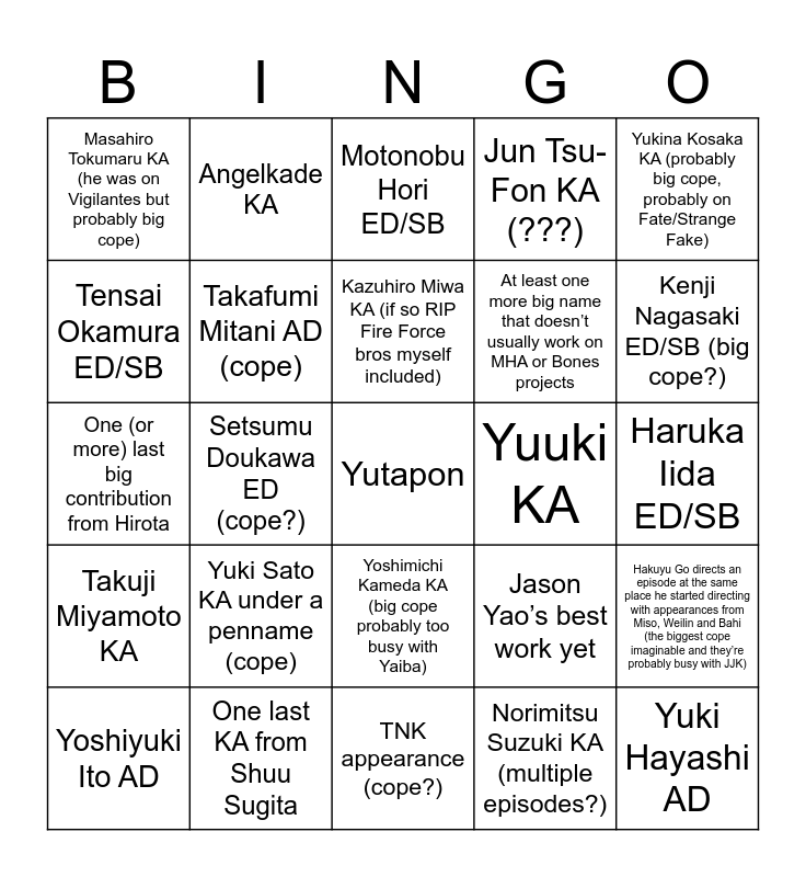 This bingo card has a free space and 24 words: Yuki Sato KA under a penname (cope), One last KA from Shuu Sugita, Kazuhiro Miwa KA (if so RIP Fire Force bros myself included), Yoshiyuki Ito AD, Yukina Kosaka KA (probably big cope, probably on Fate/Strange Fake), Masahiro Tokumaru KA (he was on Vigilantes but probably big cope), Tensai Okamura ED/SB, Angelkade KA, Yuuki KA, Yoshimichi Kameda KA (big cope probably too busy with Yaiba), At least one more big name that doesn’t usually work on MHA or Bones projects, One (or more) last big contribution from Hirota, Jason Yao’s best work yet, Hakuyu Go directs an episode at the same place he started directing with appearances from Miso, Weilin and Bahi (the biggest cope imaginable and they’re probably busy with JJK), Takafumi Mitani AD (cope), Norimitsu Suzuki KA (multiple episodes?), Haruka Iida ED/SB, Motonobu Hori ED/SB, Kenji Nagasaki ED/SB (big cope?), Setsumu Doukawa ED (cope?), Yuki Hayashi AD, Takuji Miyamoto KA, Jun Tsu-Fon KA (???) and TNK appearance (cope?).