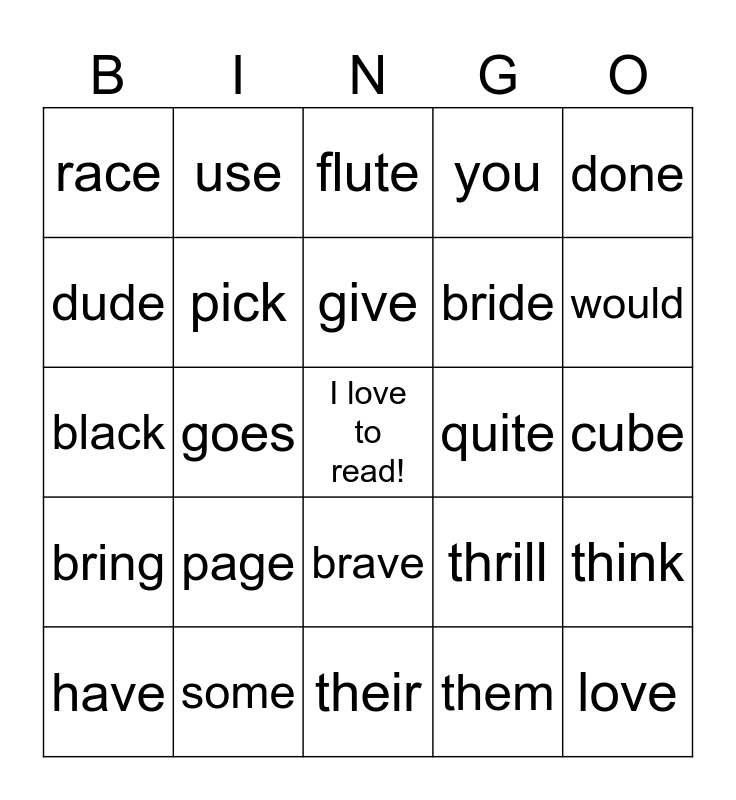 This bingo card has a free space and 24 words: page, some, give, have, done, race, dude, use, quite, brave, bride, black, thrill, think, pick, them, cube, flute, would, goes, love, bring, you and their.