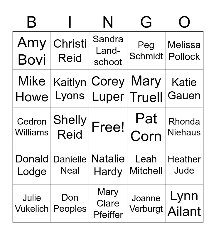This bingo card has a free space and 47 words: Michelle Frazier, Lynn Ailant, Shaniqua Wade, Mary Clare Pfeiffer, Danielle Neal, Allison Gnilka, Christi Reid, Brenna Houston, Mike Howe, Jessica Davies, Kaitlyn Lyons, Peg Schmidt, Heather Jude, Leah Mitchell, Odell Covington, Erin Rydell, Corey Luper, Pat Corn, Haley Shuping, Melissa Pollock, Shelly Reid, Joanne Verburgt, Amy Bovi, Mary Truell, Laura Shuman, Katie Gauen, Julie Vukelich, Andrew Kuzma, Natalie Hardy, Donald Lodge, Sue Wong, Angie Thull, Melanie Haire, Heather Cote, Yates Lackey, Don Peoples, Rhonda Niehaus, Karen Peters, Chrisann Lemery, Rajiv Mirchan- dani, Crystal Holmes, Sandra Land- schoot, Cedron Williams, Alli Sajdak, Maureen O’Reilly, Kate Reidell and Traci Edwards.