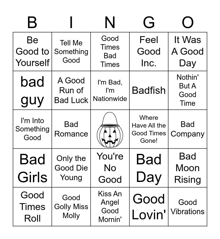 This bingo card has a free space and 45 words: Good Time, Good Vibrations, Good Directions, Good Times Roll, Are the Good Times Really Over (I Wish a Buck Was Still Silver), Good Lovin', Good Times Bad Times, Good Day Sunshine, It Was A Good Day, Good Golly Miss Molly, Feel Good Inc., Where Have All the Good Times Gone!, You're No Good, Only the Good Die Young, Hey Good Lookin', Kiss An Angel Good Mornin', Hurts So Good, I'm Into Something Good, I Got You (I Feel Good), Nothin' But A Good Time, Tell Me Something Good, Johnny B. Goode, Life's Been Good, Be Good to Yourself, Bad - 2012 Remaster, Bad Company, Bad Is Bad, Bad Medicine, Bad Day, Bad Girls, Bad, Bad Leroy Brown, Bad Moon Rising, Bad Blood, Bad Case Of Loving You (Doctor, Doctor), Two Out of Three Ain't Bad, Bad Romance, Bad To The Bone, Bad Reputation, A Bad Goodbye, I'm Bad, I'm Nationwide, bad guy, Badfish, She's A Bad Mama Jama (She's Built, She's Stacked), A Good Run of Bad Luck and Bad Time.