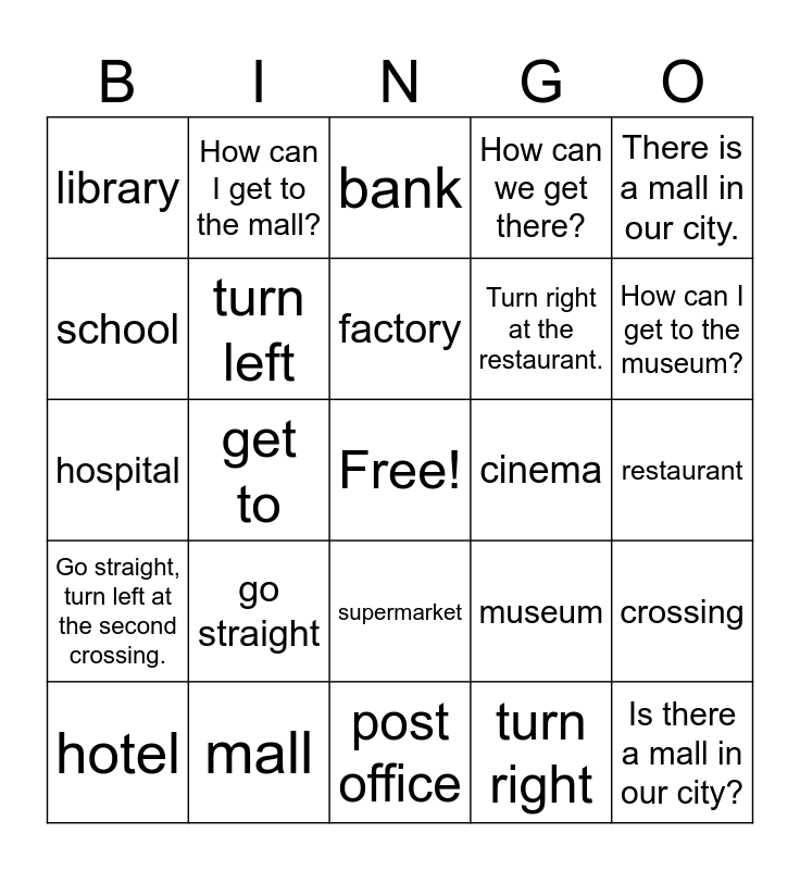 This bingo card has a free space and 24 words: go straight, mall, factory, hotel, There is a mall in our city., library, school, How can I get to the mall?, cinema, supermarket, Turn right at the restaurant., hospital, museum, crossing, turn left, turn right, restaurant, bank, How can I get to the museum?, get to, Is there a mall in our city?, Go straight, turn left at the second crossing., How can we get there? and post office.