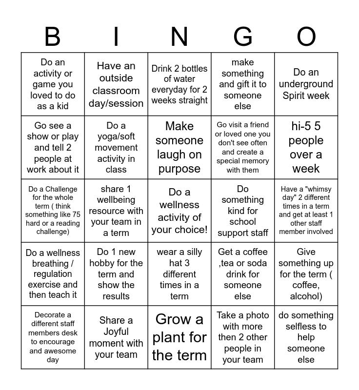 This bingo card has a free space and 34 words: Have a coffee with someone you don't know well, Take a photo with more then 2 other people in your team, Give a thank you note to someone, Do a random act of kindness, Do a wellness breathing / regulation exercise and then teach it, Do a yoga/soft movement activity in class, Do an underground Spirit week, Decorate a different staff members desk to encourage and awesome day, Have an outside classroom day/session, Do a writing Gratitude activity for a week straight, Make someone laugh on purpose, Drink 2 bottles of water everyday for 2 weeks straight, Participate in something creative with your students, Share your top 5 memes to your team, Do something kind for school support staff, hi-5 5 people over a week, Share a Joyful moment with your team, Do a Challenge for the whole term ( think something like 75 hard or a reading challenge), Do 1 new hobby for the term and show the results, Get a coffee ,tea or soda drink for someone else, wear a silly hat 3 different times in a term, Go somewhere you haven't been before local to you ( a different shop or park), Do an activity or game you loved to do as a kid, Have a "whimsy day" 2 different times in a term and get at least 1 other staff member involved, Grow a plant for the term, do something selfless to help someone else, make something and gift it to someone else, try to create 2 new wellbeing habits within the term, Go visit a friend or loved one you don't see often and create a special memory with them, Go see a show or play and tell 2 people at work about it, go cloud watching or star gazing and talk about it, share 1 wellbeing resource with your team in a term, Give something up for the term ( coffee, alcohol) and Go find a new community group to try for a term (community committees , church groups, girl guides or scouts, sports).