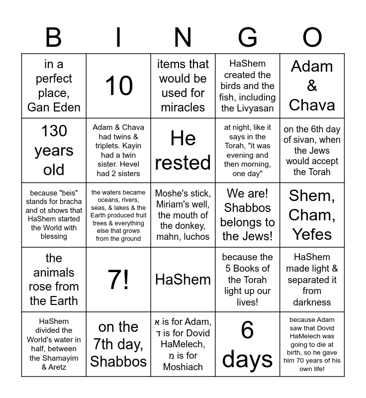This bingo card has 26 words: HaShem, 6 days, He rested, on the 7th day, Shabbos, Adam & Chava, in a perfect place, Gan Eden, 130 years old, 10, Shem, Cham, Yefes, because the 5 Books of the Torah light up our lives!, at night, like it says in the Torah, "it was evening and then morning, one day", because "beis" stands for bracha and ot shows that HaShem started the World with blessing, HaShem made light & separated it from darkness, HaShem divided the World's water in half, between the Shamayim & Aretz, the waters became oceans, rivers, seas, & lakes & the Earth produced fruit trees & everything else that grows from the ground, HaShem put the Moon & the Sun in the sky, HaShem created the birds and the fish, including the Livyasan, the animals rose from the Earth, items that would be used for miracles, Moshe's stick, Miriam's well, the mouth of the donkey, mahn, luchos, on the 6th day of sivan, when the Jews would accept the Torah, א is for Adam, ד is for Dovid HaMelech, מ is for Moshiach, We are! Shabbos belongs to the Jews!, 7!, Adam & Chava had twins & triplets. Kayin had a twin sister. Hevel had 2 sisters and because Adam saw that Dovid HaMelech was going to die at birth, so he gave him 70 years of his own life!.