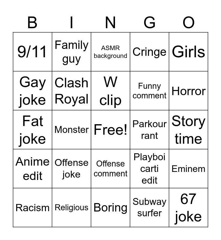 This bingo card has a free space and 24 words: Offense joke, Religious, W clip, Racism, Girls, 9/11, Gay joke, Family guy, Parkour rant, Offense comment, Funny comment, Fat joke, Playboi carti edit, Eminem, Clash Royal, Subway surfer, Story time, ASMR background, Horror, Monster, 67 joke, Anime edit, Cringe and Boring.