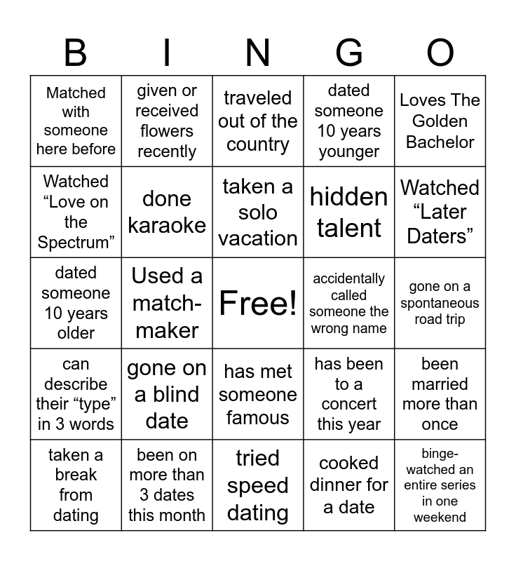 This bingo card has a free space and 24 words: gone on a blind date, been on more than 3 dates this month, taken a solo vacation, taken a break from dating, Loves The Golden Bachelor, Matched with someone here before, Watched “Love on the Spectrum”, given or received flowers recently, accidentally called someone the wrong name, has met someone famous, hidden talent, dated someone 10 years older, has been to a concert this year, been married more than once, done karaoke, cooked dinner for a date, gone on a spontaneous road trip, traveled out of the country, Watched “Later Daters”, Used a match-maker, binge-watched an entire series in one weekend, can describe their “type” in 3 words, dated someone 10 years younger and tried speed dating.
