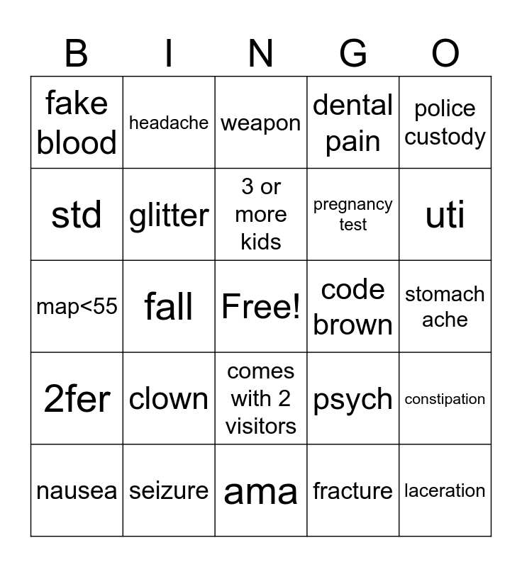 This bingo card has a free space and 29 words: nausea, diarrhea, fall, etoh, fake blood, weapon, glitter, clown, code brown, seizure, stomach ache, laceration, ama, fracture, uti, sore throat, comes with 2 visitors, 2fer, police custody, map<55, psych, back pain, pregnancy test, std, dental pain, headache, constipation, 3 or more kids and ankle pain.