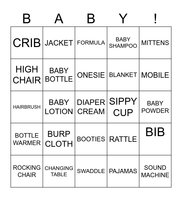 This bingo card has 38 words: DIAPERS, BABY WIPES, PACIFIER, BABY BOTTLE, BIB, BURP CLOTH, ONESIE, SOCKS, MITTENS, BLANKET, BABY LOTION, BABY SHAMPOO, DIAPER CREAM, BABY POWDER, HIGH CHAIR, BOTTLE WARMER, BREAST PUMP, FORMULA, BABY FOOD JAR, SIPPY CUP, CRIB, CHANGING TABLE, MOBILE, ROCKING CHAIR, NIGHTLIGHT, SWADDLE, SOUND MACHINE, BABY MONITOR, STUFFED ANIMAL, CRIB SHEETS, HAT, BOOTIES, PAJAMAS, JACKET, TEETHING RING, RATTLE, HAIRBRUSH and DIAPER BAG.