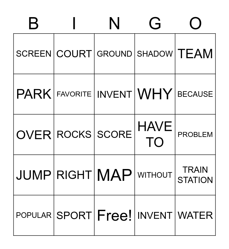 This bingo card has 25 words: JUMP, SPORT, SCORE, INVENT, TEAM, SCREEN, COURT, GROUND, HAVE TO, TRAIN STATION, PARK, FAVORITE, Free!, WITHOUT, BECAUSE, POPULAR, ROCKS, INVENT, WHY, PROBLEM, OVER, RIGHT, MAP, SHADOW and WATER.
