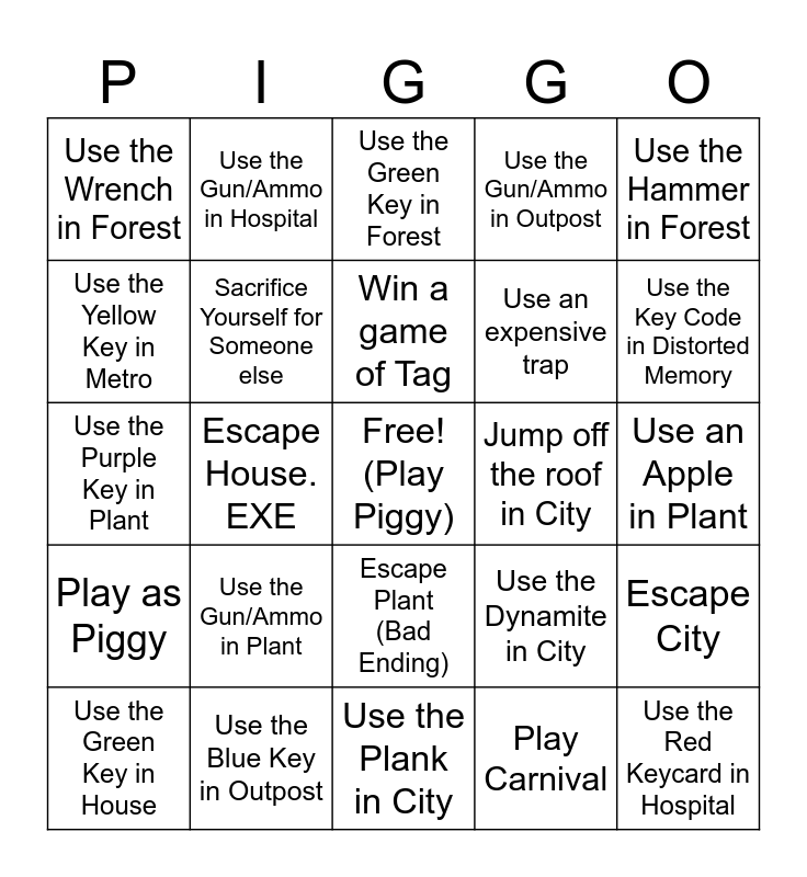 This bingo card has a free space and 277 words: Play House, Play Station, Play Gallery, Play Forest, Play School, Play Hospital, Play Metro, Play Carnival, Play City, Play Mall, Play Outpost, Play Plant, Play Distorted Memory, Play House. EXE, Jump From the 3rd Floor of House, Jump in the Goo in Station, Run into the lasers in Gallery, Jump off the Tower in Forest, Die to Doggy in Forest, Run into the lasers in School, Die to the lasers in House, Die to the Piggy in Hospital, Die to the Piggy in Metro, Die to Foxy in Carnival, Jump off the roof in City, Die to Grandmother in City, Die to Mousy in the Mall Vents, Die to the Mall's Bank lasers, Die to the lasers in Outpost, Die to the Piggy in Plant, Die to Mr. P in Plant, Get shot by Mr. P, Trip a Piggy trap, Get the same map twice in a row, Die to the lasers in Distorted Memory, Die to a Player Piggy, Die in House. EXE, Escape House, Escape Station, Escape Gallery, Escape Forest, Escape School, Escape Hospital, Escape Metro, Escape Carnival, Escape City, Escape Mall, Escape Outpost, Escape Plant (Good Ending), Escape Plant (Bad Ending), Escape Distorted Memory, Escape House. EXE, Die 3 times in a row, Trip a trap and live, Die in a Trap, Play a game with a Bot, Play a game with a Player Piggy, Play as Piggy, Play a game of Player + Bot, Play as Piggy with a Bot, Play a game of Swarm, Play a game of Infection, Play as Piggy for Infection, Play a game of Traitor, Play as the Traitor, Take out a Traitor, Play a game of Tag, Win a game of Tag, Play as a Book 1 skin, Play as an alternate Book 1 skin, Play as a Book 2 skin, Play as an alternate Book 2 skin, Play as an "Extra" Skin, Play as a "Community" Skin, As Piggy use a Tracking trap, Use Multiple survivor abilities at once, Use an expensive trap, Use an OP trap, Use a terrible trap, Kill someone in a trap, Use the Gun/Ammo in House, Use the Hammer in House, Use the Wrench in House, Use the Key Code in House, Use the Plank in House, Use the Green Gear in House, Use the Red Gear in House, Use the Red Key in House, Use the Orange Key in House, Use the Yellow Key in House, Use the Green Key in House, Use the Blue Key in House, Use the Purple Key in House, Use the White Key in House, Use the Gun/Ammo in Station, Use the Hammer in Station, Use the Wrench in Station, Use the Plank in Station, Use the Red Key in Station, Use the Orange Key in Station, Use the Yellow Key in Station, Use the Green Key in Station, Use the Blue Key in Station, Use the Purple Key in Station, Use the White Key in Station, Use a Battery in Station, Use the Gas in Station, Use the Hammer in Gallery, Use the Wrench in Gallery, Use the Plank in Gallery, Use the Red Key in Gallery, Use the Orange Key in Gallery, Use the Yellow Key in Gallery, Use the Green Key in Gallery, Use the Blue Key in Gallery, Use the Purple Key in Gallery, Use the White Key in Gallery, Use the Red Egg in Gallery, Use the Green Egg in Gallery, Use a Bone in Gallery, Use the Gun/Ammo in Forest, Use the Hammer in Forest, Use the Wrench in Forest, Use the Plank in Forest, Use the Red Key in Forest, Use the Orange Key in Forest, Use the Yellow Key in Forest, Use the Green Key in Forest, Use the Blue Key in Forest, Use the Purple Key in Forest, Use the White Key in Forest, Use the Torch in Forest, Sacrifice Yourself for Someone else, Use a Carrot in School, Use the Hammer in School, Use the Wrench in School, Use the Book in School, Use the Green Gear in School, Use the Red Gear in School, Use the Red Key in School, Use the Orange Key in School, Use the Yellow Key in School, Use the Green Key in School, Use the Blue Key in School, Use the Purple Key in School, Use the White Key in School, Use the Gun/Ammo in Hospital, Use the Hammer in Hospital, Use the Wrench in Hospital, Use the Carrot in Hospital, Use the Plank in Hospital, Use the Green Vial in Hospital, Use the Purple Vial in Hospital, Use the Red Keycard in Hospital, Use the Orange Keycard in Hospital, Use the Yellow Key in Hospital, Use the Green Keycard in Hospital, Use the Blue Keycard in Hospital, Use the Purple Key in Hospital, Use the White Key in Hospital, Use a Vial in Hospital, Use the Crossbow/Carrot in Metro, Use the Hammer in Metro, Use the Wrench in Metro, Use the Blue Keycard in Metro, Use a Coin in Metro, Use the Red Key in Metro, Use the Orange Key in Metro, Use the Yellow Key in Metro, Use the Green Key in Metro, Use the Blue Key in Metro, Use the Purple Key in Metro, Use the White Key in Metro, Use the Gun/Ammo in Carnival, Use the Hammer in Carnival, Use the Wrench in Carnival, Use the Key Code in Carnival, Use the Plank in Carnival, Use the Mallet in Carnival, Use the Water Gun in Carnival, Use the Red Key in Carnival, Use the Orange Key in Carnival, Use the Yellow Key in Carnival, Use the Green Key in Carnival, Use the Blue Key in Carnival, Use the Purple Key in Carnival, Use the White Key in Carnival, Use the Gun/Ammo in City, Use the Fire Extinguisher in City, Use the Wrench in City, Use the Key Code in City, Use the Plank in City, Use the Carrot in City, Use the Dynamite in City, Use the Red Keycard in City, Use the Orange Keycard in City, Use the Yellow Key in City, Use the Green Keycard in City, Use the Blue Keycard in City, Use the Purple Key in City, Kill Everyone as Traitor, Use the Gun/Ammo in Mall, Use the Crowbar in Mall, Use the Wrench in Mall, Use a Grass in Mall, Use the Plank in Mall, Use the Green Keycard in Mall, Use the Mirror in Mall, Use the Red Key in Mall, Use the Orange Key in Mall, Use the Yellow Key in Mall, Use the Green Key in Mall, Use the Blue Key in Mall, Use the Purple Key in Mall, Use the White Key in Mall, Use a Coin in Mall, Use the Gun/Ammo in Outpost, Use a Carrot in Outpost, Use the Wrench in Outpost, Use the Blue Keycard in Outpost, Use the Fire Extinguisher in Outpost, Use the Gas in Outpost, Use the Tank Bullet in Outpost, Use the Red Key in Outpost, Use the Orange Key in Outpost, Use the Yellow Key in Outpost, Use the Green Key in Outpost,