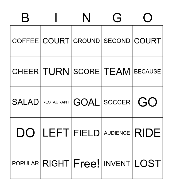 This bingo card has 25 words: DO, RIGHT, GOAL, INVENT, COURT, COFFEE, COURT, GROUND, SOCCER, RIDE, CHEER, TURN, Free!, AUDIENCE, BECAUSE, POPULAR, RESTAURANT, SCORE, TEAM, GO, SALAD, LEFT, FIELD, SECOND and LOST.