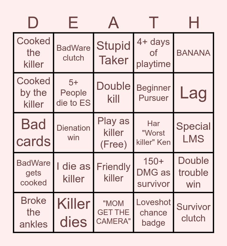 This bingo card has a free space and 24 words: I die as killer, Killer dies, Double kill, Broke the ankles, BANANA, Cooked the killer, Cooked by the killer, BadWare clutch, Har "Worst killer" Ken, Friendly killer, Beginner Pursuer, Bad cards, 150+ DMG as survivor, Double trouble win, 5+ People die to ES, Loveshot chance badge, Special LMS, Stupid Taker, Lag, Dienation win, Survivor clutch, BadWare gets cooked, 4+ days of playtime and "MOM GET THE CAMERA".