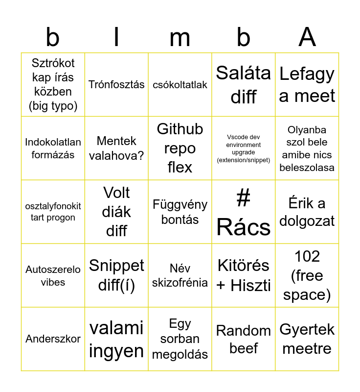 This bingo card has a free space and 39 words: C# utalás, Angol kiejtés diff, Tisztakód superior, Mentek valahova?, Anderszkor, Név skizofrénia, Github repo flex, Vektor xd, Lefagy a meet, Autoszerelo vibes, Volt diák diff, Saláta diff, Gyertek meetre, Érik a dolgozat, # Rács, Snippet diff(í), Propörti, Sztrókot kap írás közben (big typo), Mi legyen a neve?, Kitörés + Hiszti, Indokolatlan formázás, Egy sorban megoldás, Vscode dev environment upgrade (extension/snippet), Olyanba szol bele amibe nics beleszolasa, Elrontja a kódot és 5 percig gondolkozik rajta, Túlbonyolít, Urak Holgyek, OOP dicsoites, non/nan/null, Trónfosztás, Csüccse le, ... huncutságok, csókoltatlak, valami ingyen, Random beef, feláll, beszél és visszaül, 102 (free space), osztalyfonokit tart progon and feltűnően másolja a kódot valahonnan.
