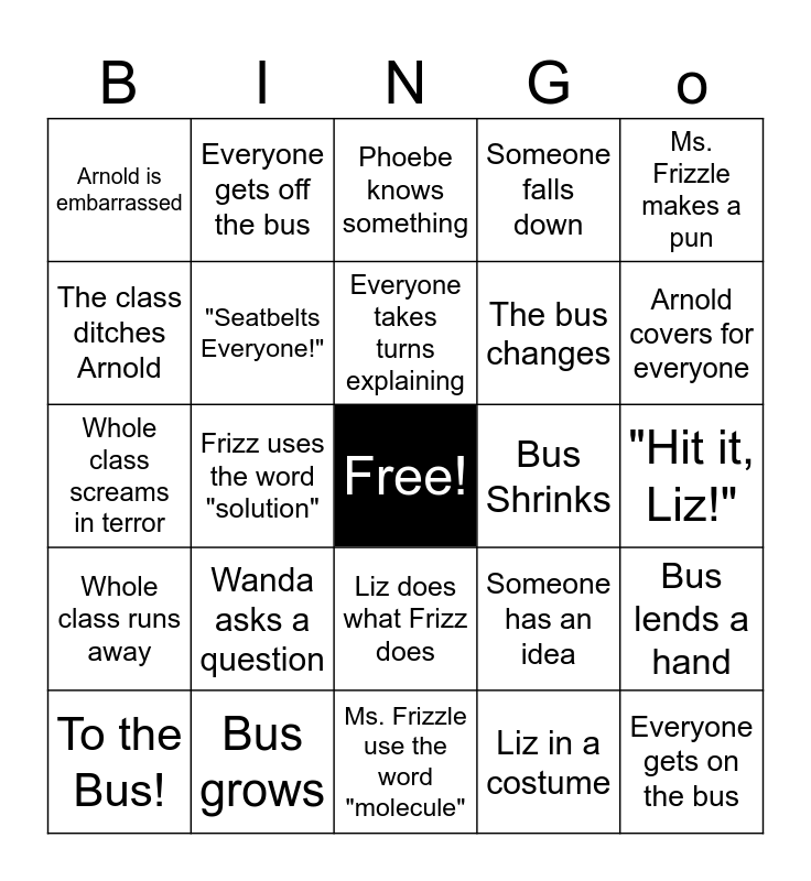 This bingo card has a free space and 29 words: To the Bus!, Ms. Frizzle winks, Frizz uses the word "solution", Ralph learns something, Arnold is embarrassed, Phoebe knows something, "Seatbelts Everyone!", Wanda asks a question, Bus Shrinks, Bus grows, "Hit it, Liz!", Everyone gets on the bus, Ms. Frizzle use the word "molecule", Liz in a costume, Arnold covers for everyone, Bus dances, Liz does what Frizz does, Whole class runs away, Ms. Frizzle makes a pun, Whole class screams in terror, Someone has an idea, Keisha is skeptical, The bus changes, The class ditches Arnold, Someone falls down, Everyone gets off the bus, Bus lends a hand, Everyone takes turns explaining and A kid says "molecule".