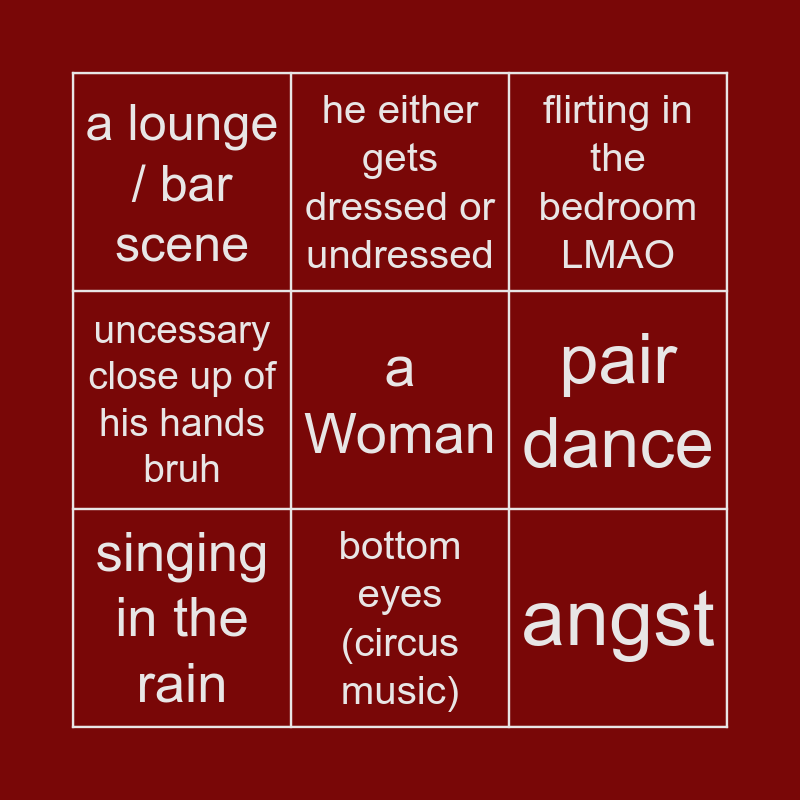 This bingo card has 9 words: singing in the rain, flirting in the bedroom LMAO, he either gets dressed or undressed, uncessary close up of his hands bruh, a lounge / bar scene, pair dance, a Woman, angst and bottom eyes (circus music).