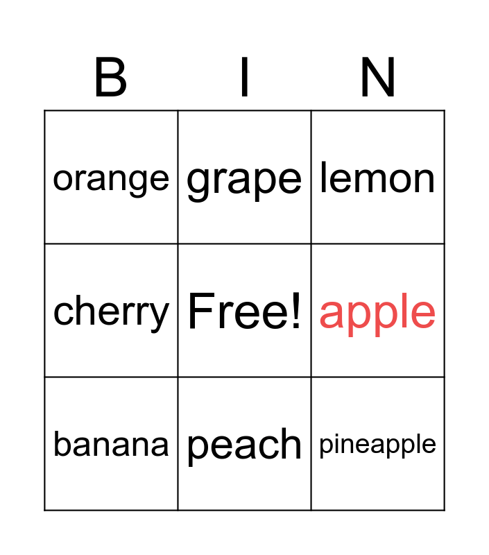 This bingo card has a free space and 8 words: apple, lemon, grape, banana, orange, pineapple, cherry and peach.