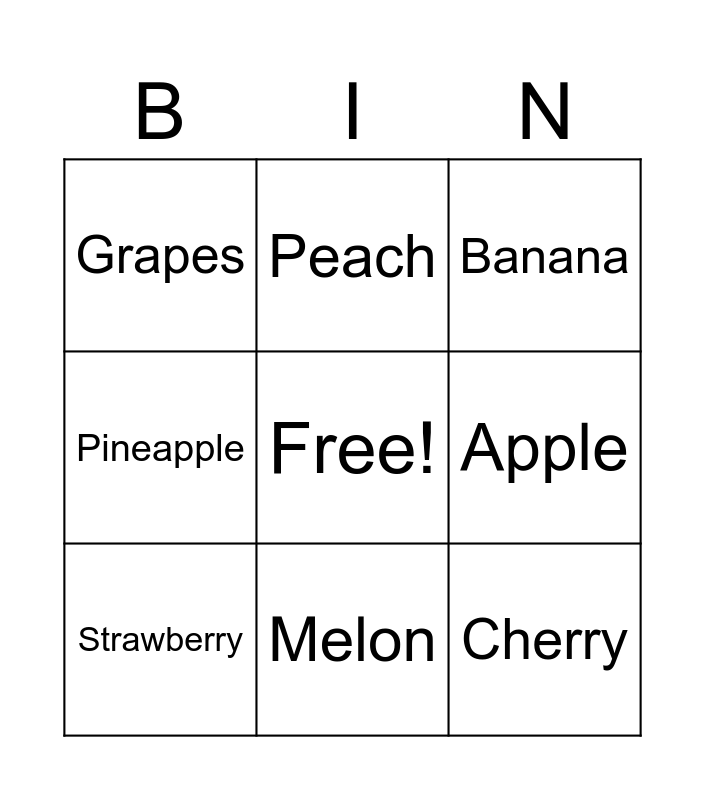 This bingo card has a free space and 8 words: Apple, Banana, Peach, Strawberry, Grapes, Cherry, Pineapple and Melon.