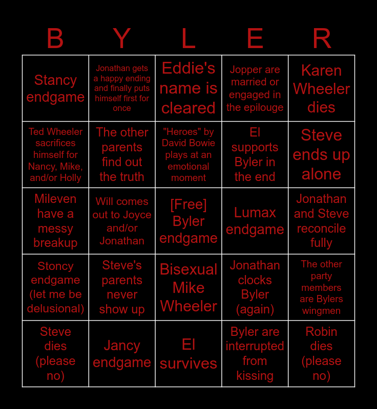 This bingo card has a free space and 24 words: Steve's parents never show up, Jancy endgame, "Heroes" by David Bowie plays at an emotional moment, Steve dies (please no), Karen Wheeler dies, Stancy endgame, Ted Wheeler sacrifices himself for Nancy, Mike, and/or Holly, Jonathan gets a happy ending and finally puts himself first for once, Lumax endgame, Bisexual Mike Wheeler, El supports Byler in the end, Mileven have a messy breakup, Jonathan clocks Byler (again), The other party members are Bylers wingmen, The other parents find out the truth, Byler are interrupted from kissing, Jonathan and Steve reconcile fully, Eddie's name is cleared, Steve ends up alone, Will comes out to Joyce and/or Jonathan, Robin dies (please no), Stoncy endgame (let me be delusional), Jopper are married or engaged in the epilouge and El survives.