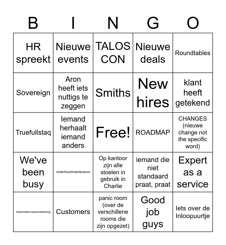 This bingo card has a free space and 24 words: Automation/automatisering, onderhoud/maintenance, Smiths, Good job guys, Roundtables, HR spreekt, Nieuwe events, TALOS CON, ROADMAP, CHANGES (nieuwe change not the specific word), Truefullstaq, Aron heeft iets nuttigs te zeggen, iemand die niet standaard praat, praat, Expert as a service, Sovereign, Customers, panic room (over de verschillene rooms die zijn opgezet), Nieuwe deals, klant heeft getekend, We've been busy, Iemand herhaalt iemand anders, Op kantoor zijn alle stoelen in gebruik in Charlie, New hires and Iets over de Inloopuurtje.