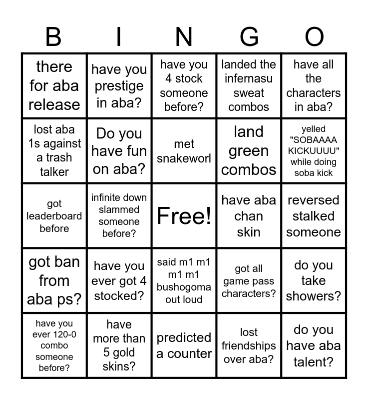 This bingo card has a free space and 24 words: have you ever 120-0 combo someone before?, have you ever got 4 stocked?, met snakeworl, lost friendships over aba?, have all the characters in aba?, there for aba release, have you prestige in aba?, have you 4 stock someone before?, have aba chan skin, reversed stalked someone, got leaderboard before, Do you have fun on aba?, got all game pass characters?, do you take showers?, lost aba 1s against a trash talker, have more than 5 gold skins?, predicted a counter, landed the infernasu sweat combos, yelled "SOBAAAA KICKUUUU" while doing soba kick, got ban from aba ps?, infinite down slammed someone before?, said m1 m1 m1 m1 bushogoma out loud, land green combos and do you have aba talent?.