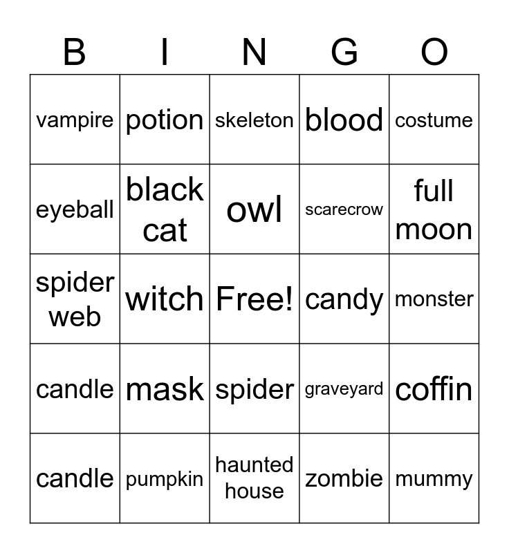 This bingo card has a free space and 30 words: pumpkin, ghost, witch, bat, vampire, skeleton, black cat, spider, candy, haunted house, monster, mummy, zombie, broom, full moon, tombstone, graveyard, candle, mask, costume, spider web, magic, potion, scarecrow, eyeball, blood, coffin, candle, owl and trick.