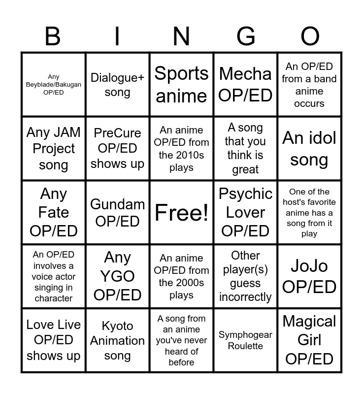 This bingo card has a free space and 39 words: Nana Mizuki sings an OP/ED, fripSide sings an OP/ED, Detective Conan song random appearance, PreCure OP/ED shows up, Love Live OP/ED shows up, An anime OP/ED from the 2000s plays, An anime OP/ED from the 2010s plays, An anime OP/ED from the 2020s plays, An OP/ED from a band anime occurs, An OP/ED involves a voice actor singing in character, Gundam OP/ED, Mecha OP/ED, Magical Girl OP/ED, One of the host's favorite anime has a song from it play, Psychic Lover OP/ED, Any YGO OP/ED, Any Vanguard OP/ED, Any Beyblade/Bakugan OP/ED, Host guesses incorrectly, Other player(s) guess incorrectly, Any JAM Project song, A song from an anime you've never heard of before, A song that you think is great, An idol song, An anime from 2025, Bocchi The Rock, Kaguya-Sama song, ZAQ song, OxT song, Dialogue+ song, Masaki Endoh song, T.M. Revolution song, Sports anime, Kyoto Animation song, Symphogear Roulette, YuYuYu Roulette, JoJo OP/ED, Any Fate OP/ED and Any anime by JC Staff.