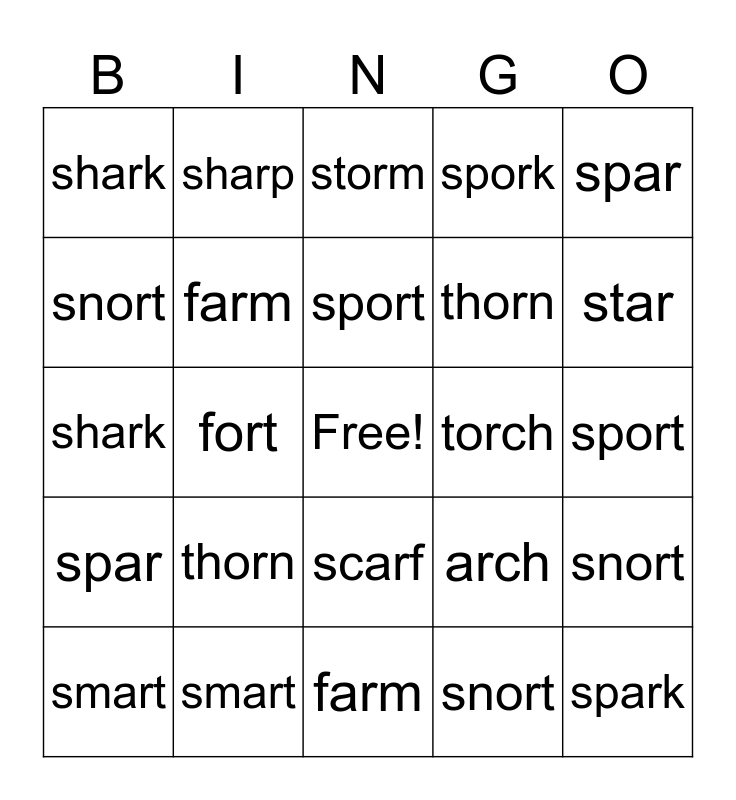 ⚠ This card has duplicate items: short (3), scarf (3), storm (3), snarl (3), porch (3), Bart (3), dark (3), north (3), arch (3), star (3), thorn (3), stork (3), sport (3), snort (5), torch (3), fort (3), park (3), spark (3), spar (3), smart (3), shark (3), farm (3), sharp (3), far (2)