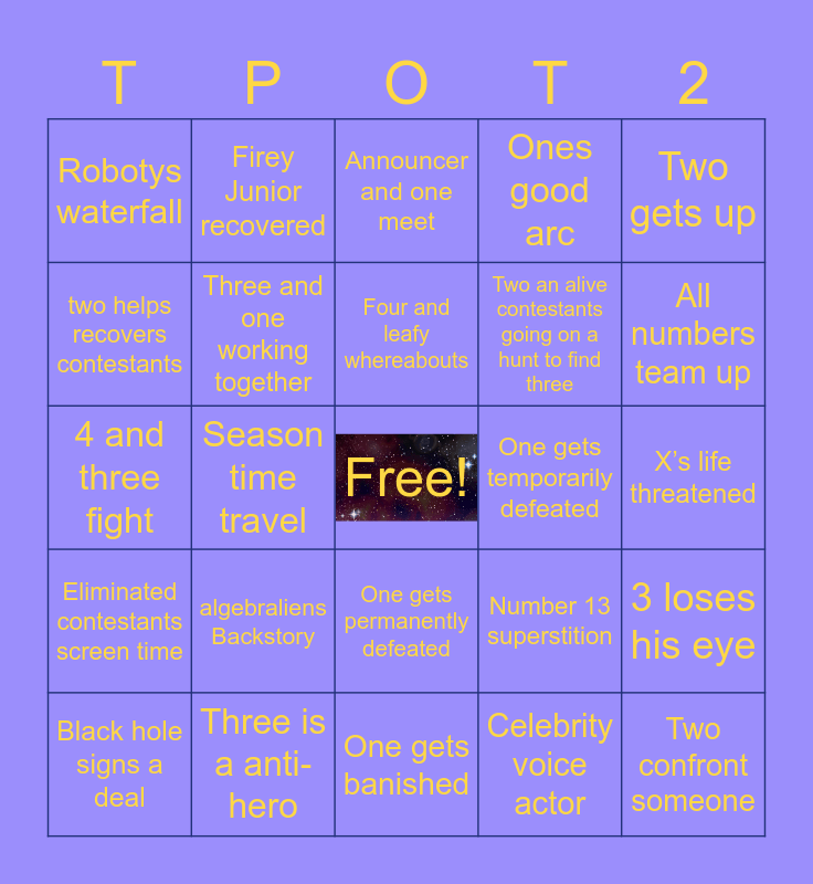 This bingo card has a free space and 24 words: algebraliens Backstory, Three is a anti-hero, Four and leafy whereabouts, Black hole signs a deal, Two gets up, Robotys waterfall, two helps recovers contestants, Firey Junior recovered, One gets temporarily defeated, One gets permanently defeated, Two an alive contestants going on a hunt to find three, 4 and three fight, Number 13 superstition, 3 loses his eye, Three and one working together, Celebrity voice actor, X’s life threatened, Announcer and one meet, All numbers team up, Season time travel, Two confront someone, Eliminated contestants screen time, Ones good arc and One gets banished.