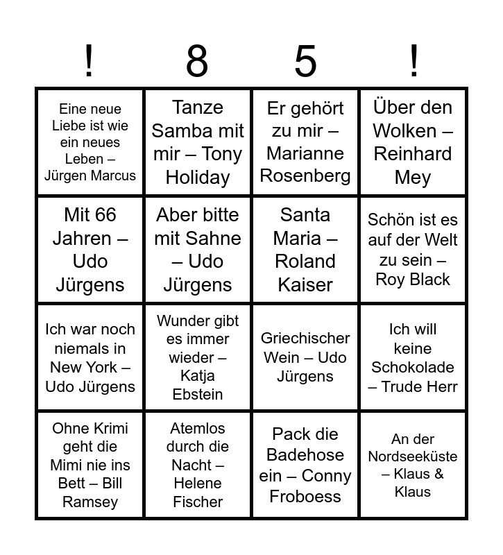 This bingo card has 40 words: Der Papa wird`s schon richten – Peter Alexander, Griechischer Wein – Udo Jürgens, Verlieben, verloren, vergessen, verzeih´n – Wolfgang Petry, Santa Maria – Roland Kaiser, Du hast mich tausendmal belogen – Andrea Berg, Verdammt ich lieb dich – Matthias Reim, Schön ist es auf der Welt zu sein – Roy Black, Ein bisschen Spaß muss sein – Roberto Blanco, Mit 66 Jahren – Udo Jürgens, An der Nordseeküste – Klaus & Klaus, Ich will keine Schokolade – Trude Herr, Über den Wolken – Reinhard Mey, Ohne Krimi geht die Mimi nie ins Bett – Bill Ramsey, Pack die Badehose ein – Conny Froboess, Atemlos durch die Nacht – Helene Fischer, Für mich solls rote Rosen regnen – Hildegard Knef, Die kleine Kneipe – Peter Alexander, Eine neue Liebe ist wie ein neues Leben – Jürgen Marcus, Siebzehn Jahr, blondes Haar – Udo Jürgens, Er gehört zu mir – Marianne Rosenberg, Ich liebe das Leben – Vicky Leandros, Marmor, Stein und Eisen bricht – Drafi Deutscher, Ich war noch niemals in New York – Udo Jürgens, Aber bitte mit Sahne – Udo Jürgens, Du hast den Farbfilm vergessen – Nina Hagen, Über sieben Brücken musst du gehen – Karat, Schön ist es auf der Welt zu sein – Roy Black, Anita, Er gehört zu mir – Marianne Rosenberg, Königin der Nacht – Peter Orloff, Fiesta Mexicana – Rex Gildo, Ganz in Weiss – Roy Black, Immer wieder sonntags – Cindy & Bert, Wann wird’s mal wieder richtig Sommer – Rudi Carell, Rote Lippen soll man küssen – Cliff Richard, Wunder gibt es immer wieder – Katja Ebstein, Schöne Maid – Tony Marshall, Ein Bett im Kornfeld – Jürgen Drews, Die rote Sonne von Barbados – Die Flippers, Tanze Samba mit mir – Tony Holiday and Lotosblume – Die Flippers.