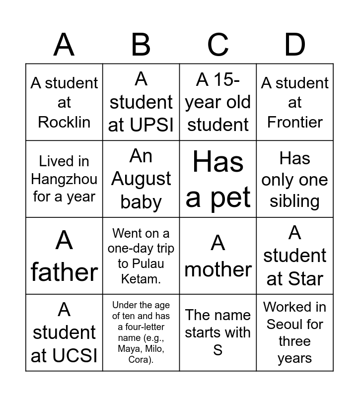 This bingo card has 16 words: A student at UCSI, Under the age of ten and has a four-letter name (e.g., Maya, Milo, Cora)., A 15-year old student, A student at Frontier, Lived in Hangzhou for a year, A student at UPSI, A mother, A student at Star, A student at Rocklin, An August baby, The name starts with S, Has only one sibling, A father, Went on a one-day trip to Pulau Ketam., Has a pet and Worked in Seoul for three years.