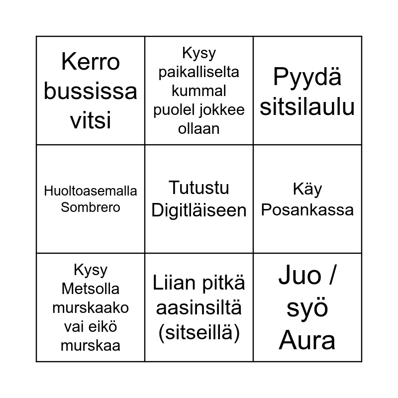 This bingo card has a free space and 8 words: Käy Posankassa, Pyydä sitsilaulu, Kysy paikalliselta kummal puolel jokkee ollaan, Kysy Metsolla murskaako vai eikö murskaa, Kerro bussissa vitsi, Juo / syö Aura, Huoltoasemalla Sombrero and Liian pitkä aasinsiltä (sitseillä).